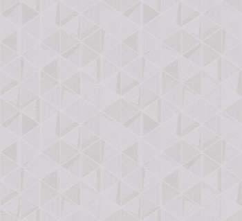 Luxusní vliesová tapeta na zeď, šedý podklad s bílým plastickým šrafováním a stříbrnými metalickými konturami trojúhelníků .