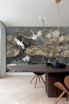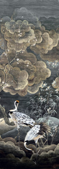 Vliesová obrazová tapeta na zeď, jemná textilní textura, pozadí v odstínech černé a šedé, šedo hnědé kvetoucí sakury a letící bílo šedí jeřábi s červenou chocholkou.