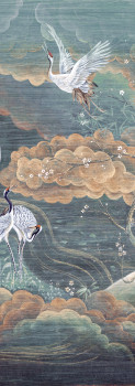 Vliesová obrazová tapeta na zeď, jemná textilní textura, pozadí v odstínech zelené, šedé a bílé, zlato hnědé kvetoucí sakury a letící bílo šedí jeřábi s červenou chocholkou.