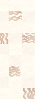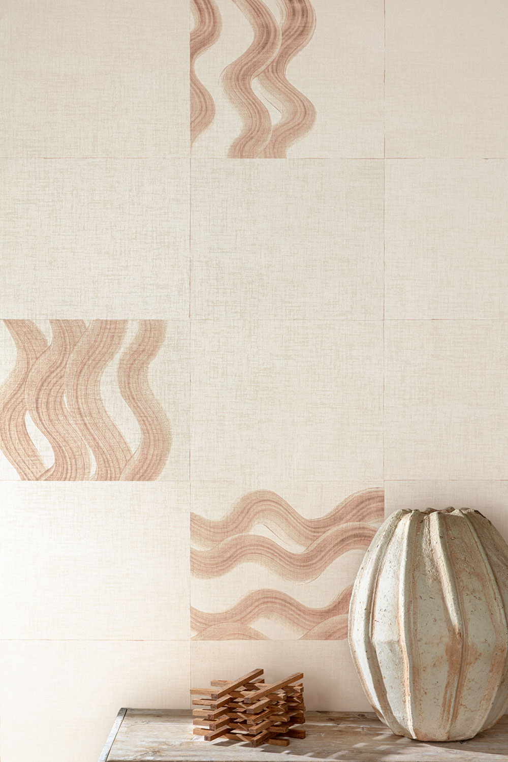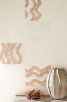 Vliesová obrazová tapeta na zeď, jemně textilní textura, podklad v odstínech šedo růžové, béžové obruby čtverců a hnědo růžové vlnky.