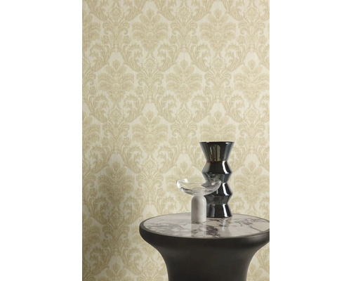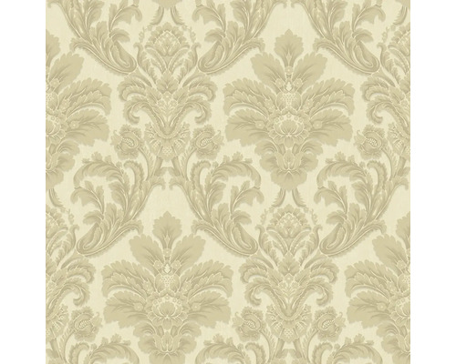 Vliesová tapeta s vinylovým povrchem, zámecký damaškový vzor v odstínech béžové a zlaté.