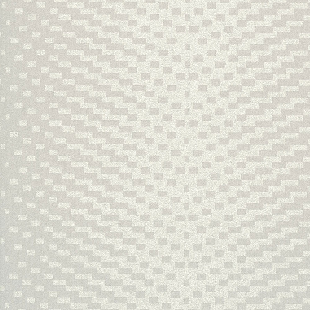 Vliesová šedá tapeta s bílým geometrickým vzorem s jemným perlovým pololeskem.