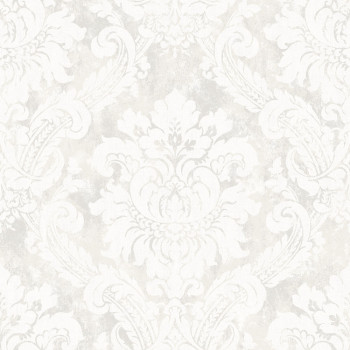 Luxusní vliesová tapeta na zeď, šedo-bílý podklad se stříbrnou patinou, zámecký damaškový vzor v bílé barvě s textilní strukturou.