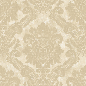 Luxusní vliesová tapeta na zeď, béžovo-bílý podklad se zlatou patinou, zámecký damaškový vzor v béžové barvě s textilní strukturou.