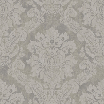 Luxusní vliesová tapeta na zeď, šedý podklad se stříbrnou patinou, zámecký damaškový vzor v bílé barvě s textilní strukturou.