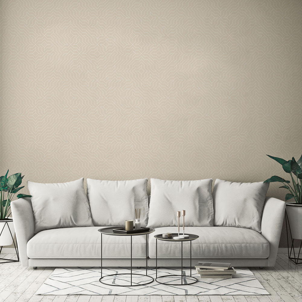 Vliesová, šedo-béžová tapeta, metalické bílé linie.