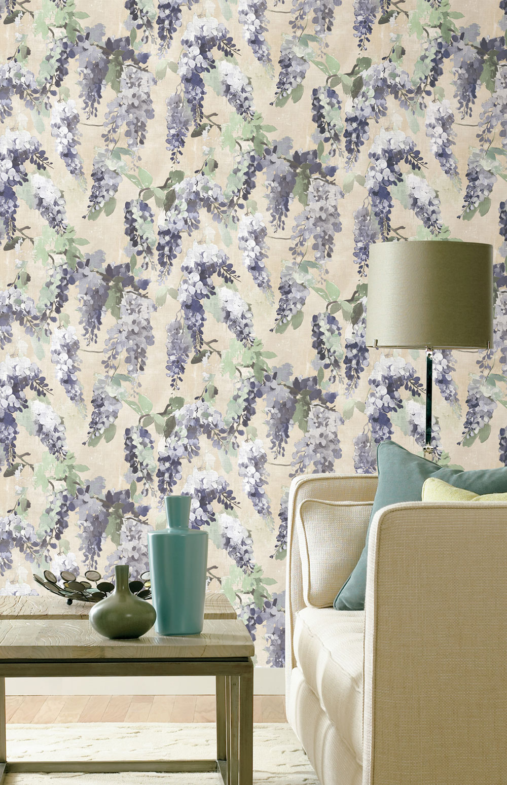 Vliesová tapeta na zeď, design rozkvetlých šeříkových větviček, bílo-béžový podklad evokuje látkovou strukturu, větvičky v odstínech modré a zelené.