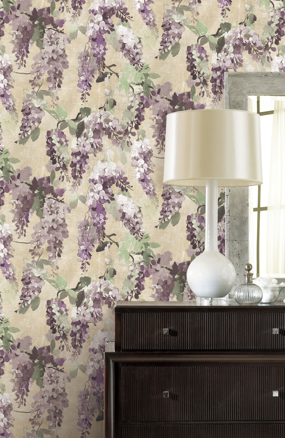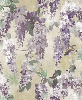 Vliesová tapeta na zeď, design rozkvetlých šeříkových větviček, běžovo-šedý podklad evokuje látkovou strukturu, větvičky v odstínech hnědé, fialové, bílé a zelené.