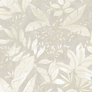 Vliesová tapeta na zeď, design listů a větviček, šedo-béžový podklad, listy v odstínech béžové a bílé, béžové kontury.