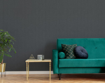 Vinylová tapeta. Imitace plastické hrubé látky v odstínech šedo-černé / antracit, prosvítající metalický podklad.
