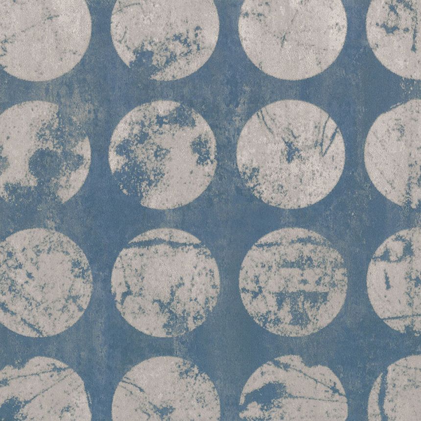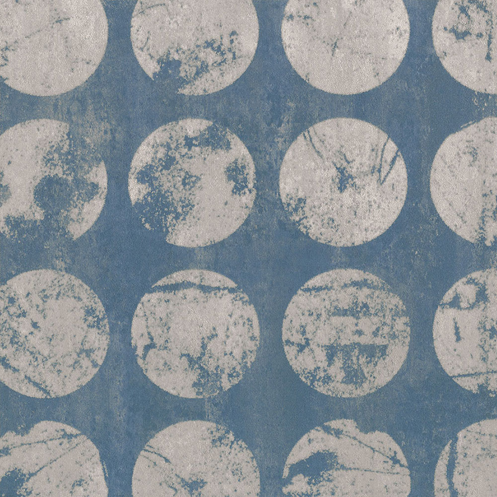 Vliesová, modrá tapeta se stříbrným geometrickým vzorem.