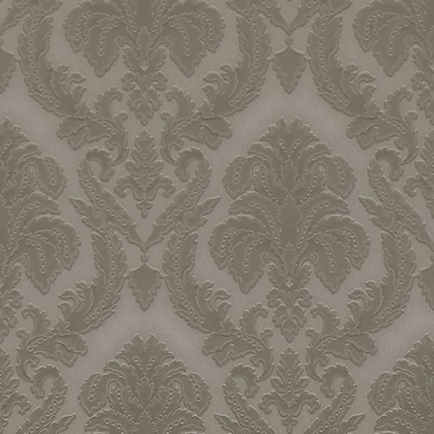 Vliesová šedo-hnědá vliesová tapeta na zeď s plastickým zámeckým vzorem a jemným leskem. Tapeta vypadá jako z materiálu koženka nebo kůže.