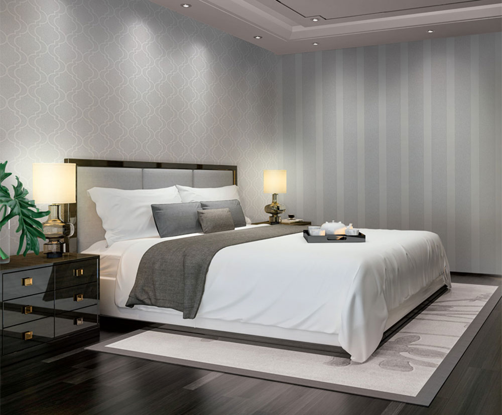 Luxusní vliesová tapeta na zeď v šedo-stříbrných odstínech se vzorem kamínků a jemným leskem a výrazným stříbrným vzorem ve stylu Art Deco. Moderní vliesové tapety do ložnice.