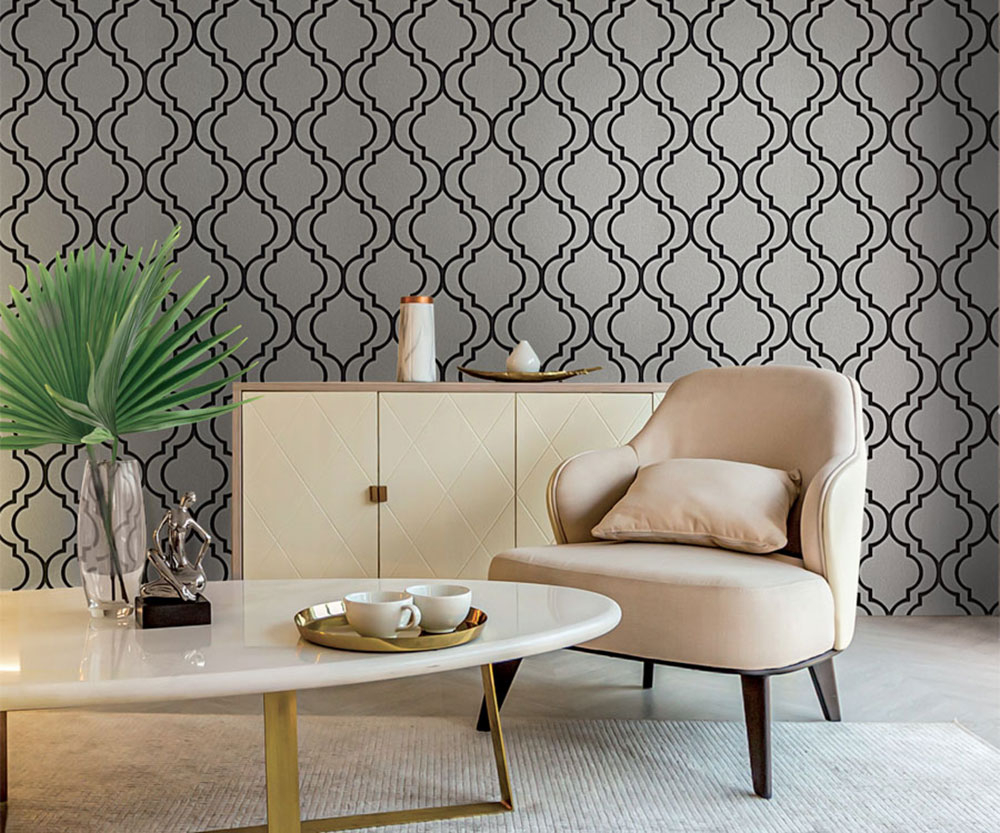 Luxusní vliesová tapeta na zeď v bílo-stříbrném odstínu se vzorem kamínků a jemným leskem a výrazným černým vzorem ve stylu Art Deco. Moderní vliesové tapety do ložnice.