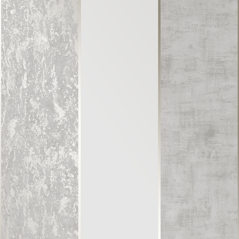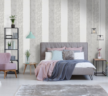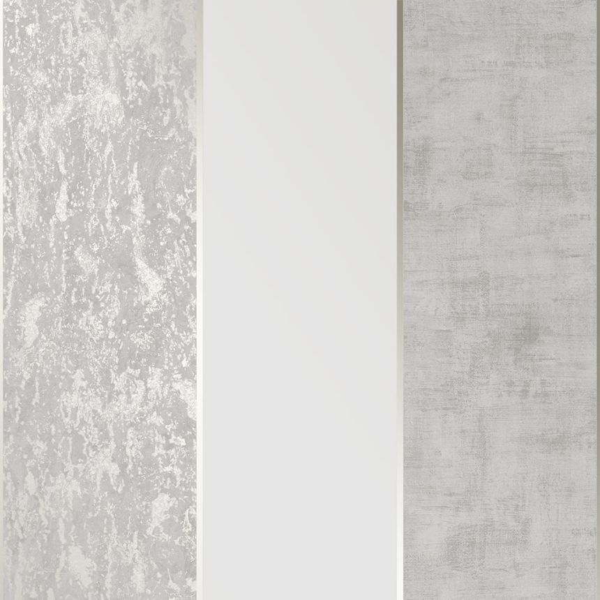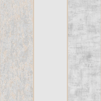 Vinylová tapeta. Střídání plastických, žíhaných a jednobarevných hladkých matných ploch a prolisů v odstínech šedé, šedo-béžové a světlého zlata.