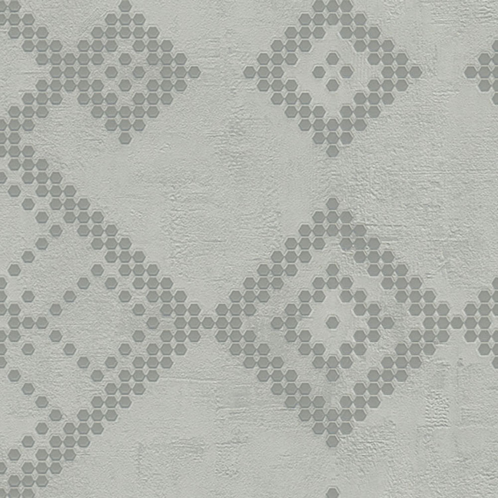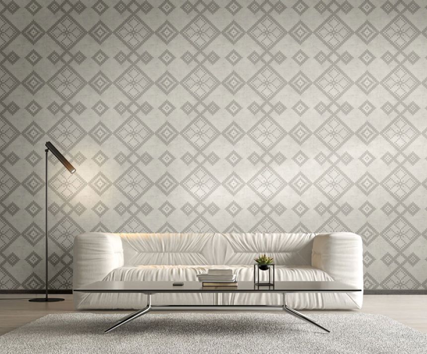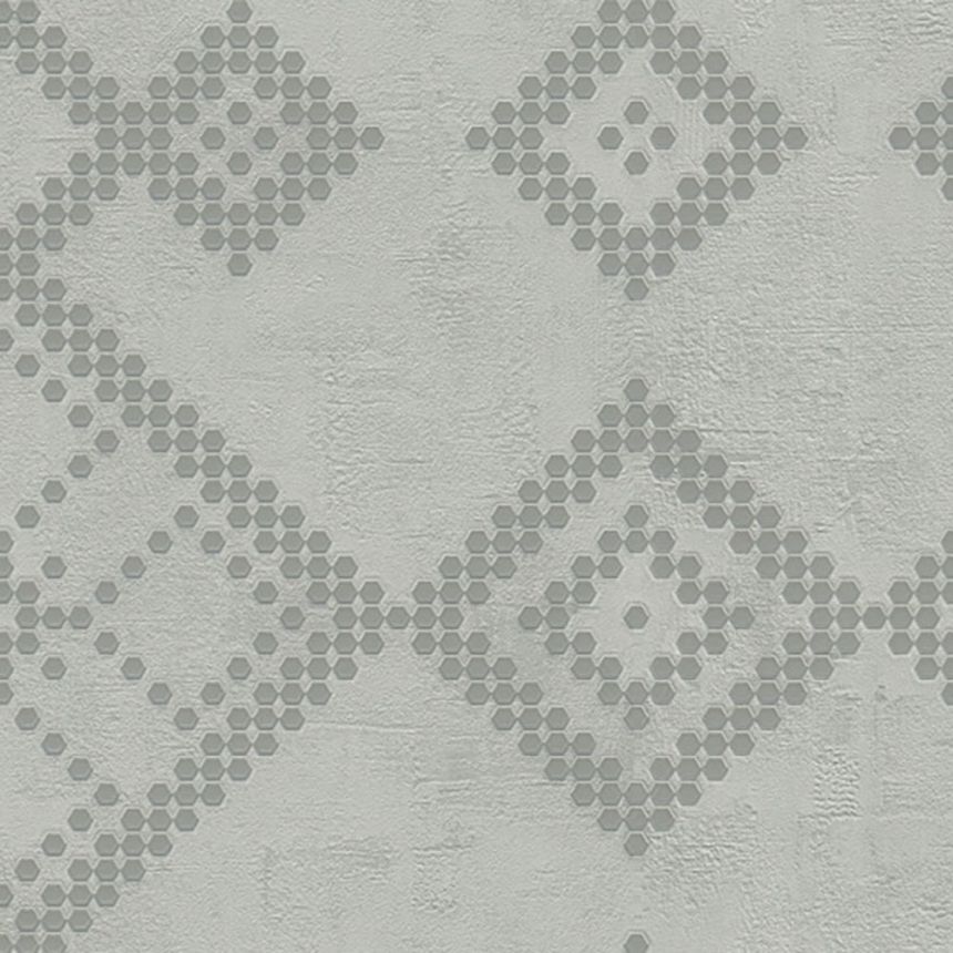 Šedá vliesová tapeta na zeď s jemným leskem a geometrickým vzorem.