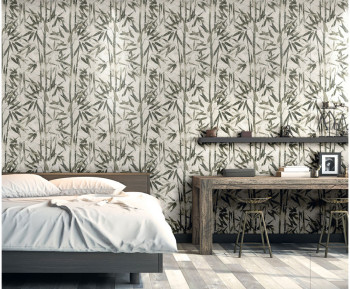 Bílá vliesová tapeta na zeď s geometrickým podkladem a metalickým vzorem bambusu.