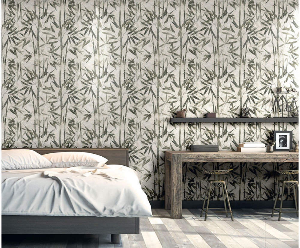 Béžová vliesová tapeta na zeď s geometrickým podkladem a zeleným metalickým vzorem bambusu.