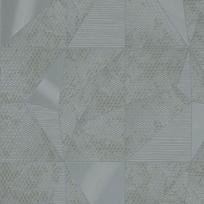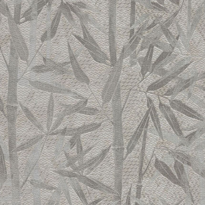 Šedá vliesová tapeta na zeď s geometrickým podkladem a metalickým vzorem bambusu.
