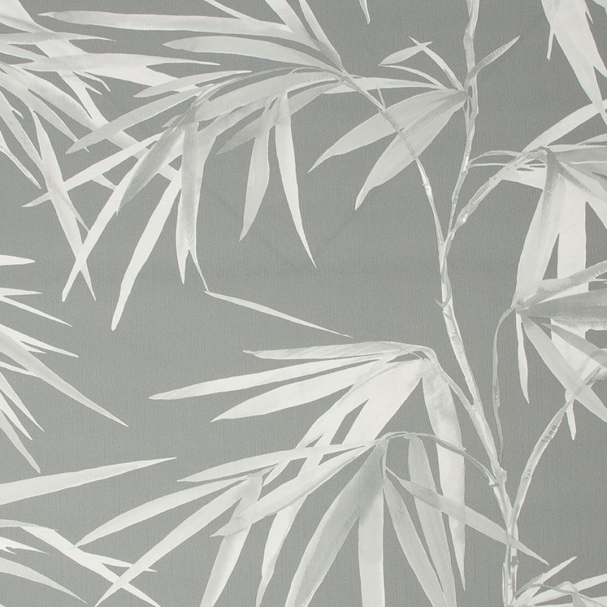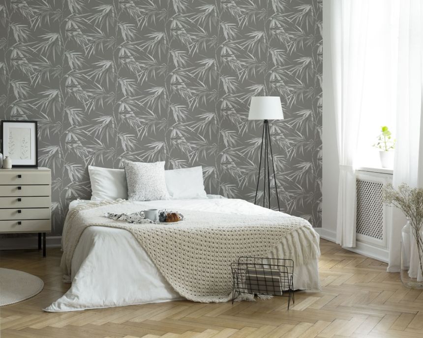 Vliesová, tmavě šedá tapeta s šedými a bílými listy.