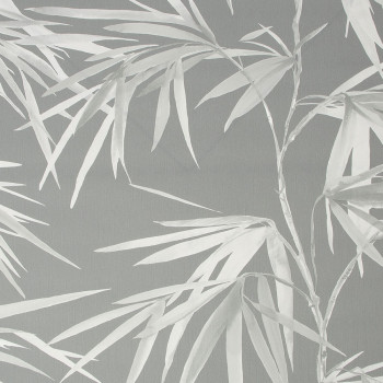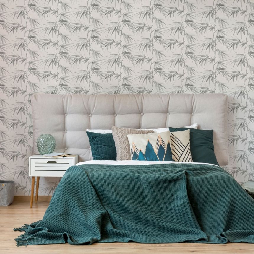 Vliesová, světle šedá tapeta s šedými listy.