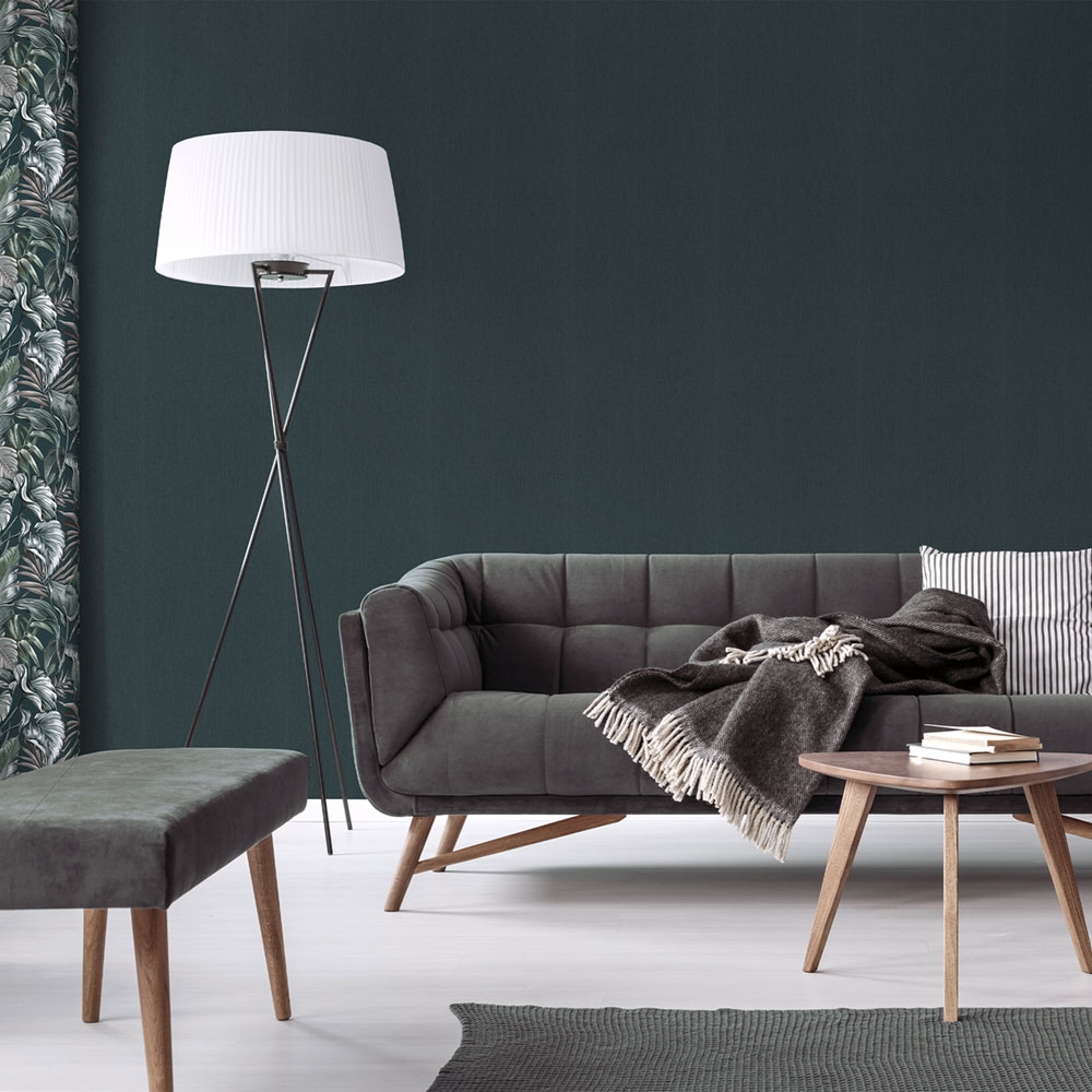 Vliesová, jemné žíhaná, temně zelená tapeta.