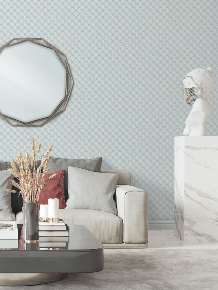 Luxusní tapeta vliesová. Tapeta je šedomodrá s šedostříbrným vzorem.