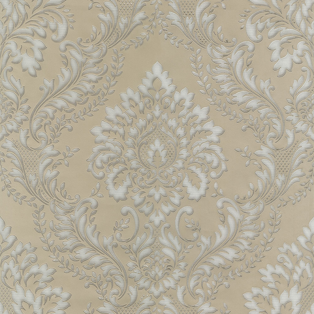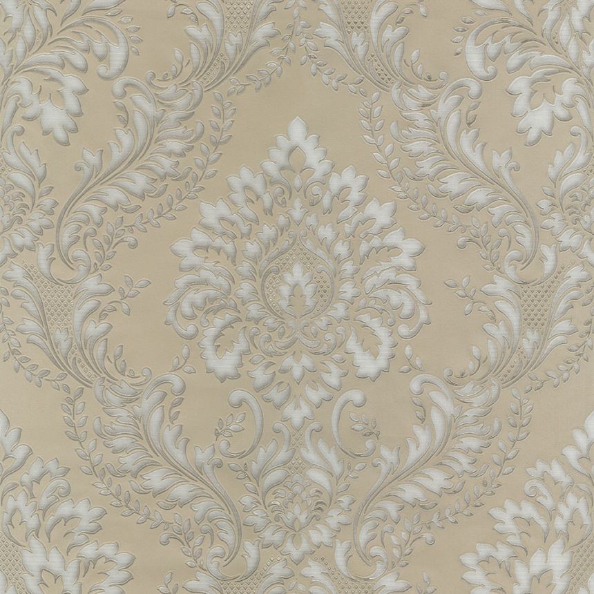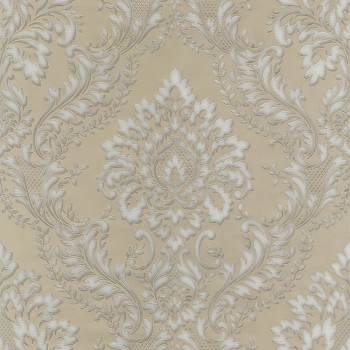Vliesová zámecká tapeta na zeď. Béžový podklad, stříbrný damaškový vzor.