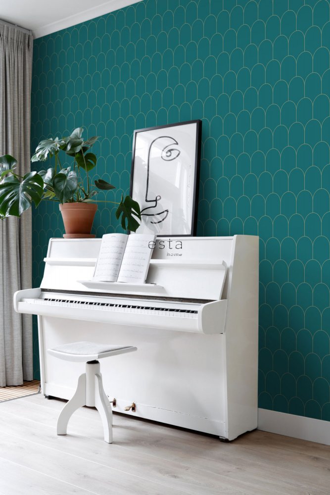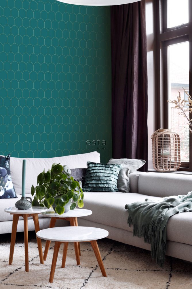 Tyrkysová vliesová tapeta, geometrický obloukový vzor 139205, Art Deco, Esta