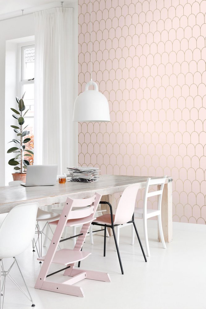 Vliesova tapeta na zed, růžová se zlatými liniemi.