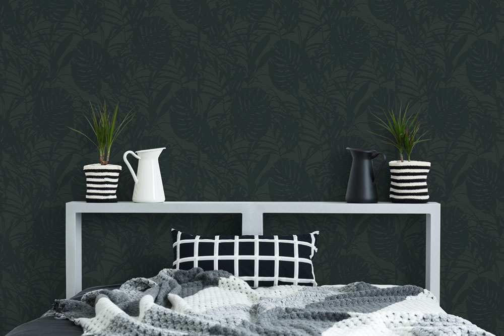 Vliesová, matně zelená tapeta s palmami - prolisovaný pololesk.
