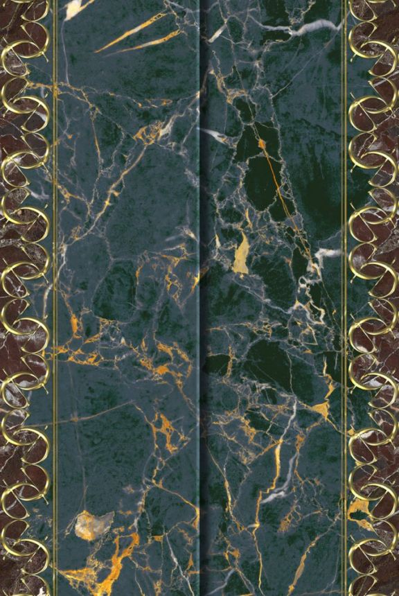 Luxusní vliesový 2dílný dekorační panel se vzorem mramoru v černo-zlatých barvách s geometrickým zlatým vzorem po okrajích tapety. Kombinovatelná se vzorem Z64899