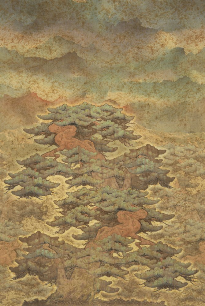 Luxusní vliesový 2dílný dekorační panel v hnědo-okrových odstínech - bonsai v japonské zahradě. Kombinovatelná se vzorem Z64895