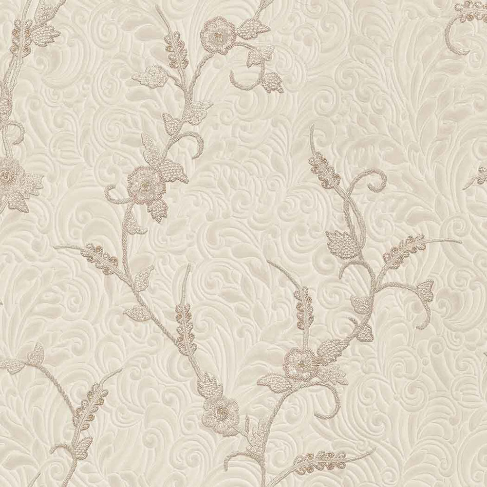 Luxusní vliesová tapeta s vinylovým povrchem s neobvyklým vzorem - plastické vlnky a lístky v béžovém odstínu se zlatým vzorem větviček s květinami a lístky.