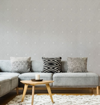 Vliesová tapeta s vinylovým povrchem. Geometrický 3D vzor v odstínech šedé, stříbrné třpytky.