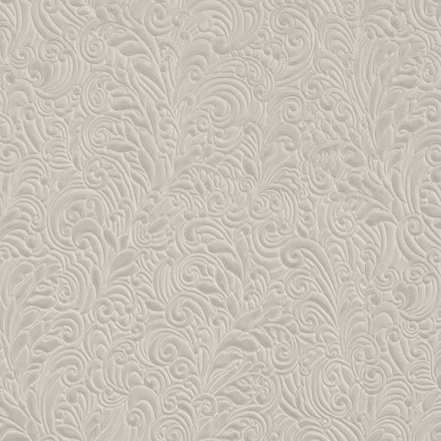 Luxusní vliesová tapeta s vinylovým povrchem s neobvyklým vzorem - plastické vlnky a lístky v šedo-béžovém odstínu se zlatým a zeleným vzorem větviček s květinami a lístky.