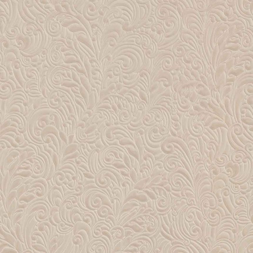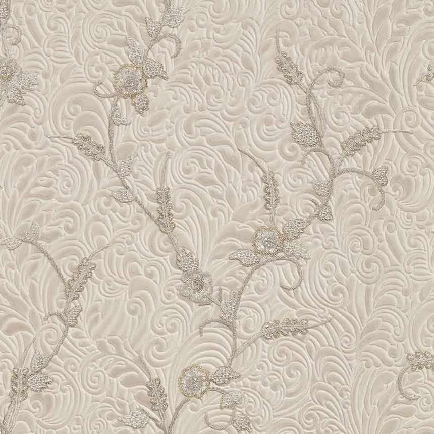 Luxusní vliesová tapeta s vinylovým povrchem s neobvyklým vzorem - plastické vlnky a lístky v béžovém odstínu se zlato-stříbrným vzorem větviček s květinami a lístky.