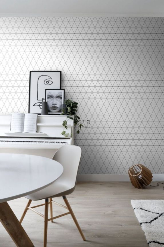 Vliesova geometrická tapeta bílá, trojúhelníky černé.