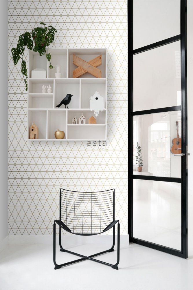 Vliesova geometrická tapeta bílá, trojúhelníky zlaté.