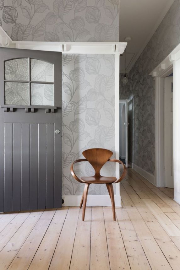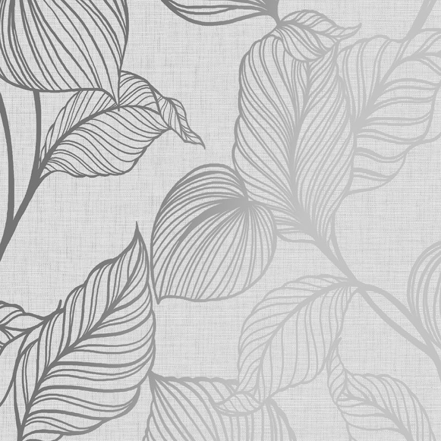 Vliesová, šedo-stříbrná tapeta s výraznými texturami. Metalický design listů stříbrných listů.