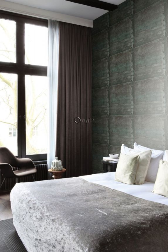 Metalická hnědozelená vliesová tapeta na zeď, dekor kovové desky s nýty.