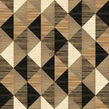 Geometrická vliesová tapeta, vzor přírodní rohože v odstínech hnědé, béžové a černé.