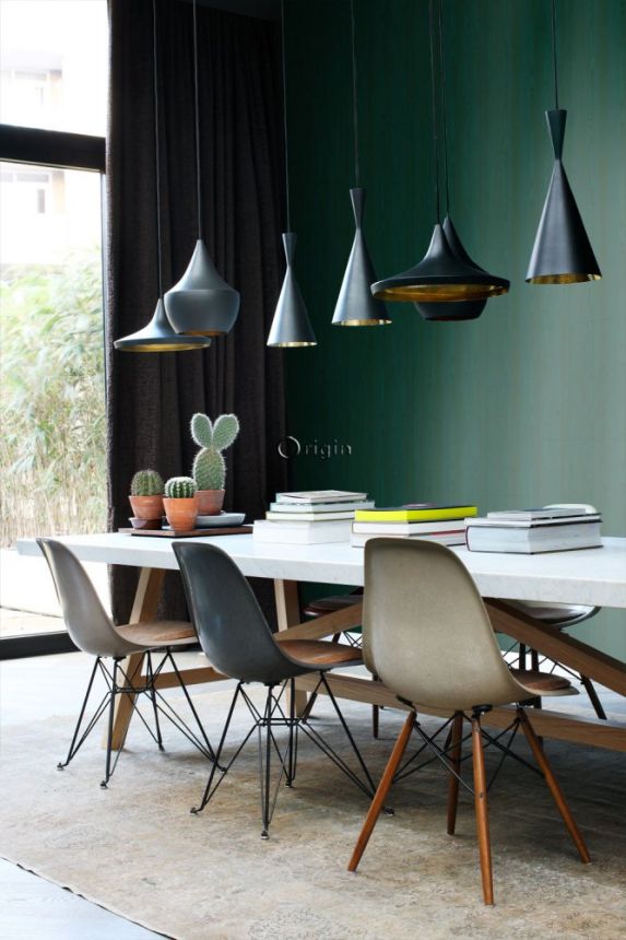 Metalická zelená vliesová tapeta na zeď, imitace dřeva, jemná textura.