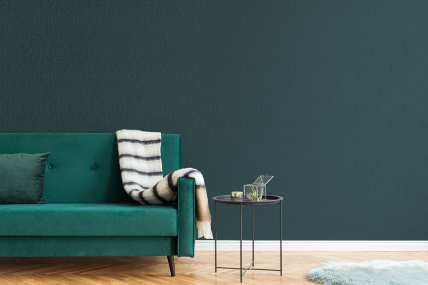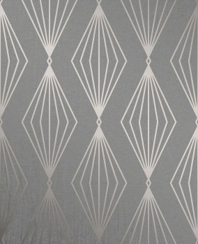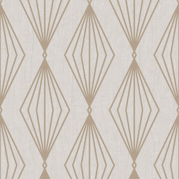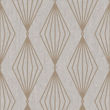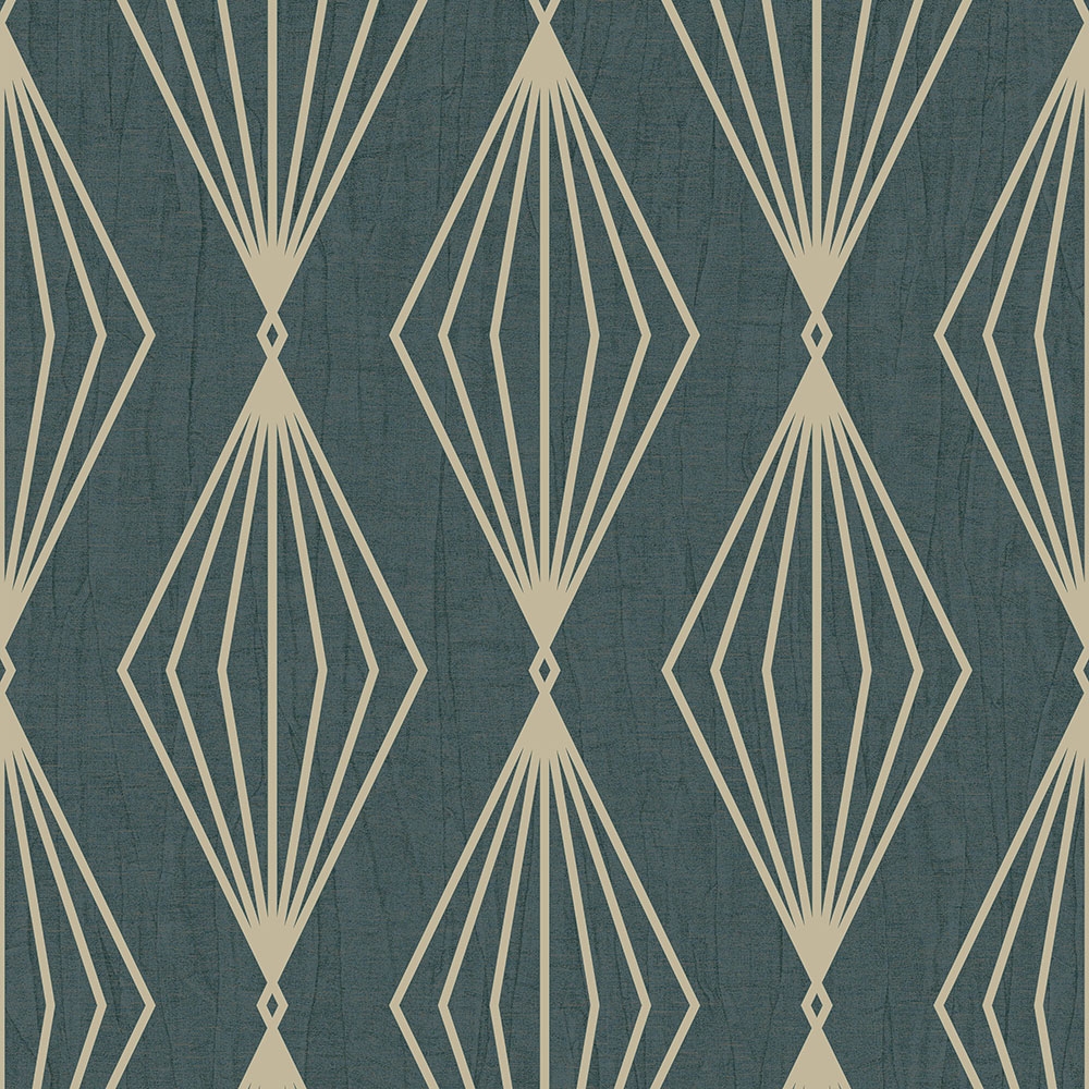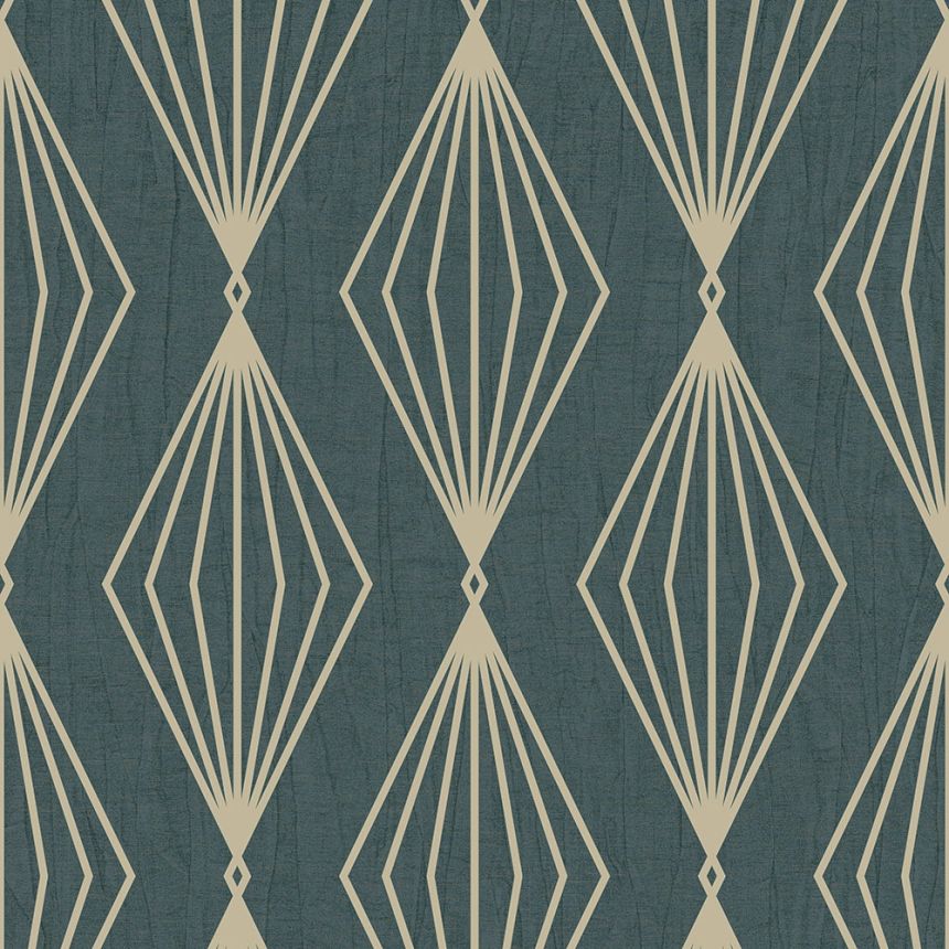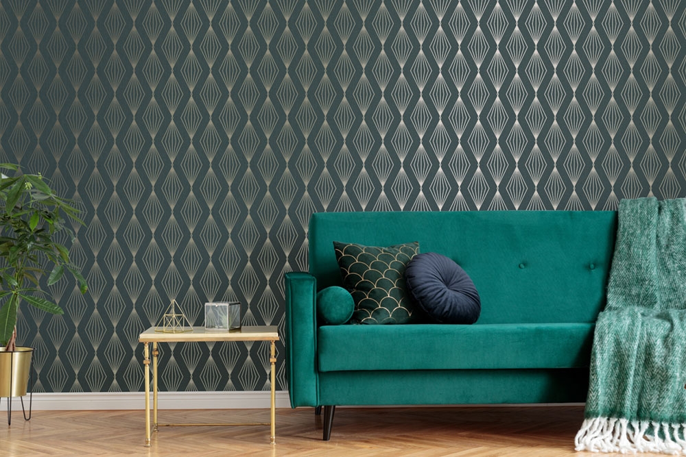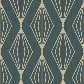 Vliesová tapeta s vinylovým povrchem. Vzor diamantu s metalicky zlatavými obrysy se stříbrnými flitry, podklad tapety smaragdově zelený s bronzovými odlesky.