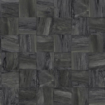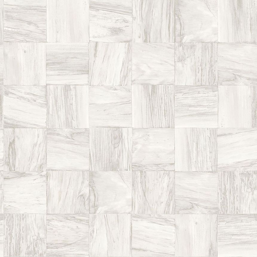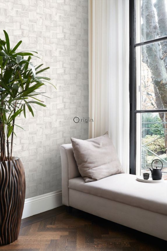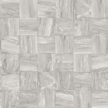 Šedobílá vliesová tapeta na zeď, imitace čtvercového dřevěného obložení.