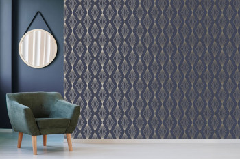 Vliesová tapeta s vinylovým povrchem. Vzor diamantu se stříbrnými flitry, podklad tapety safírový / tmavě modrý s bronzovými odlesky.