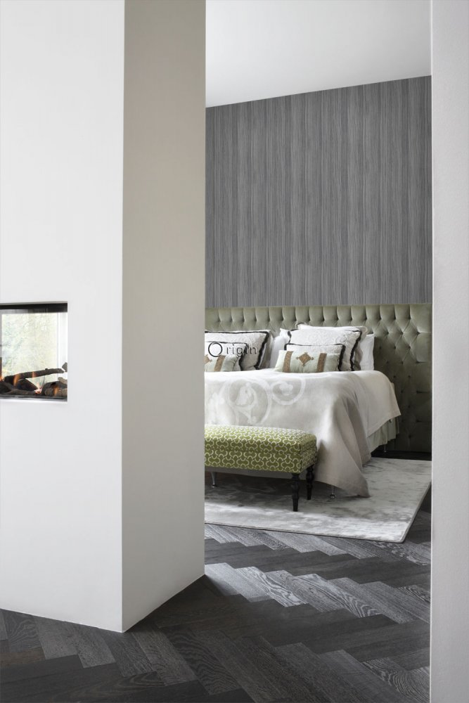 Šedá vliesová tapeta na zeď, imitace dřeva. Tapeta má jemnou texturu.