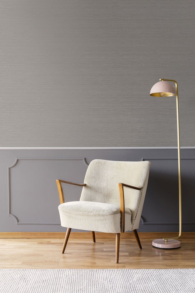Vliesová tapeta s plastickým vinylovým povrchem - imitace hrubší textilie.Tapeta je šedá s metalickým stříbrným žíháním.