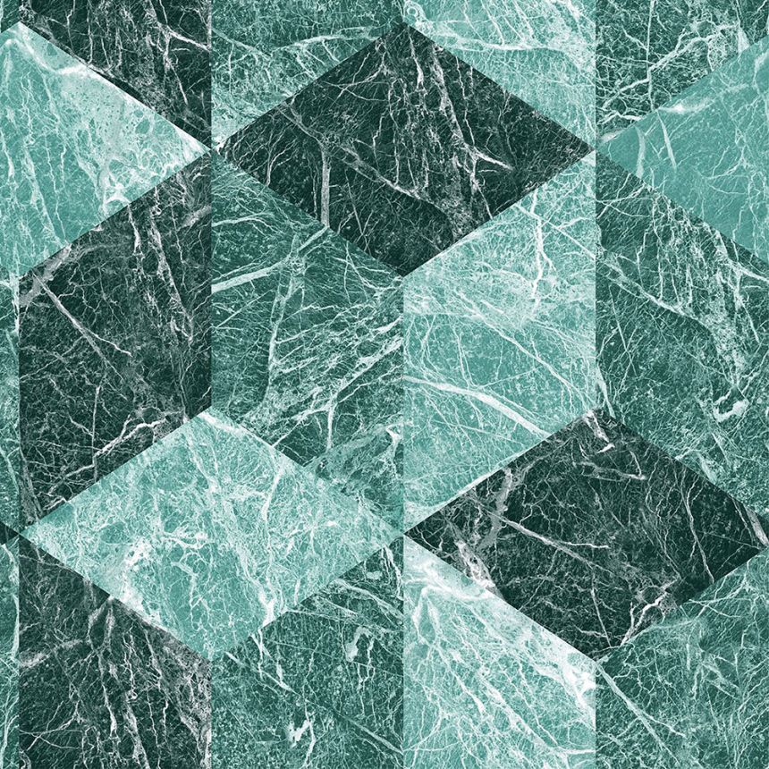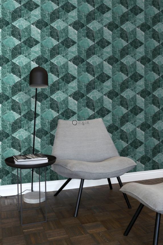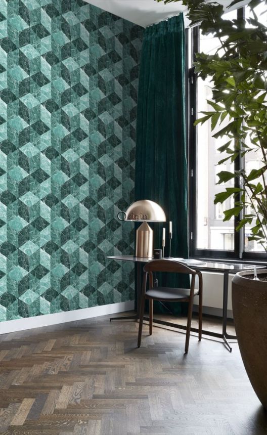 Geometrická vliesová tapeta na zeď, imitace zeleného mramorového 3D obkladu.