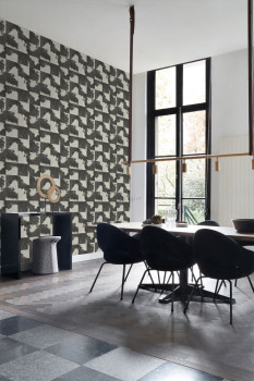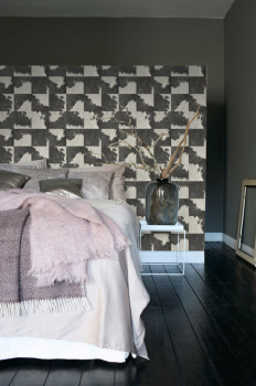 Vliesová tapeta na zeď, imitace šedočerné kožešiny ve čtvercích.